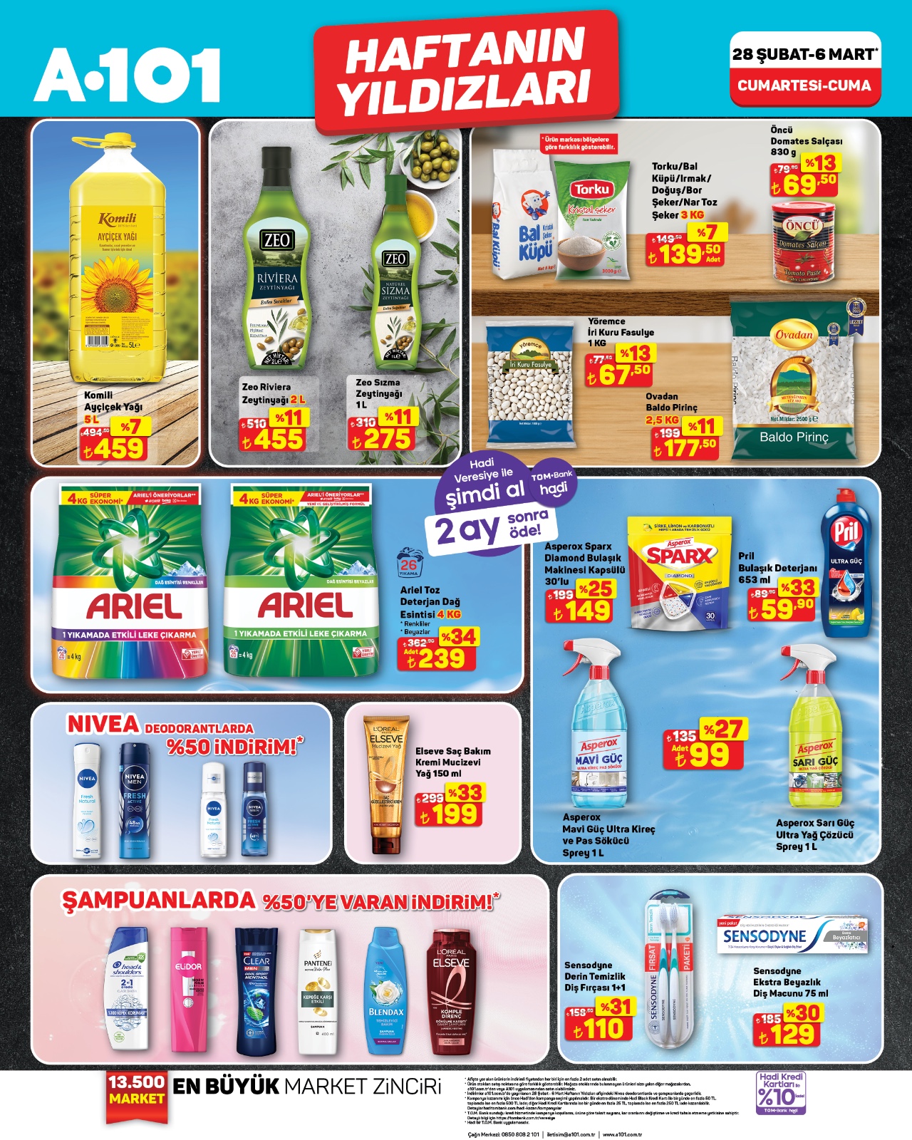 A101 market zinciri, 28 Şubat ile 6 Mart tarihleri arasında geçerli olan “Haftanın Yıldızları” ve 5 Mart “Aldın Aldın” broşürlerini paylaştı. Ayçiçek yağından Ariel deterjana, ETİ atıştırmalıklardan Paşabahçe cam ürünlerine kadar yüzlerce üründe etiketler aşağı çekildi. İşte güncel fiyat listesi…