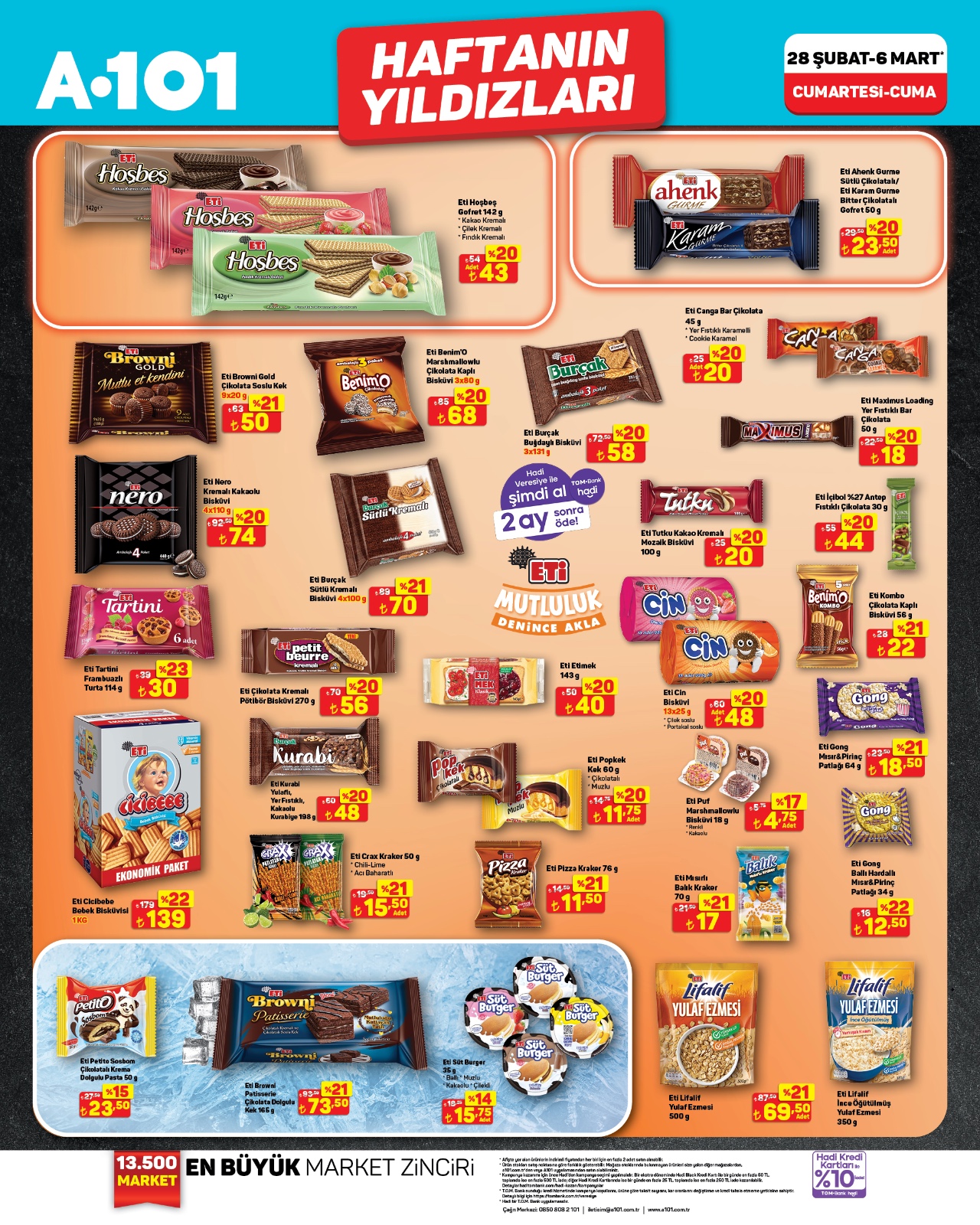 A101 bu hafta ETİ markalı ürünlerde büyük bir kampanya başlattı. Cici Bebe’den Browni Gold’a, Popkek’ten Lifalif Yulaf Ezmesi’ne kadar tüm sevilen atıştırmalıklarda %20 ve üzeri indirim uygulanıyor.