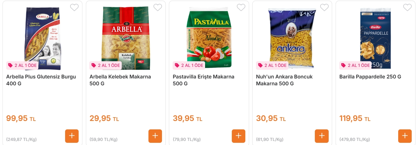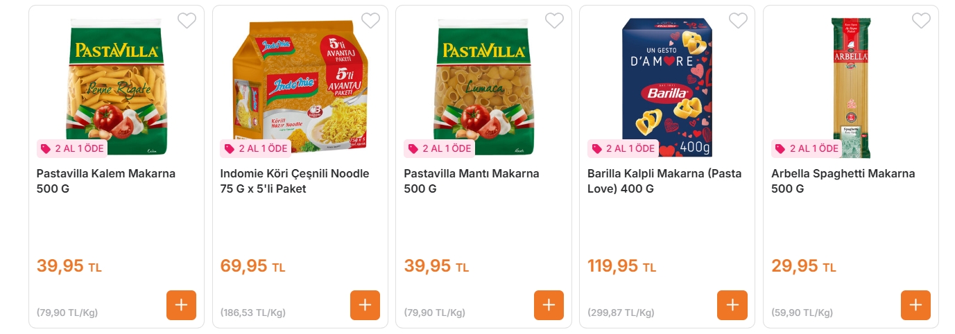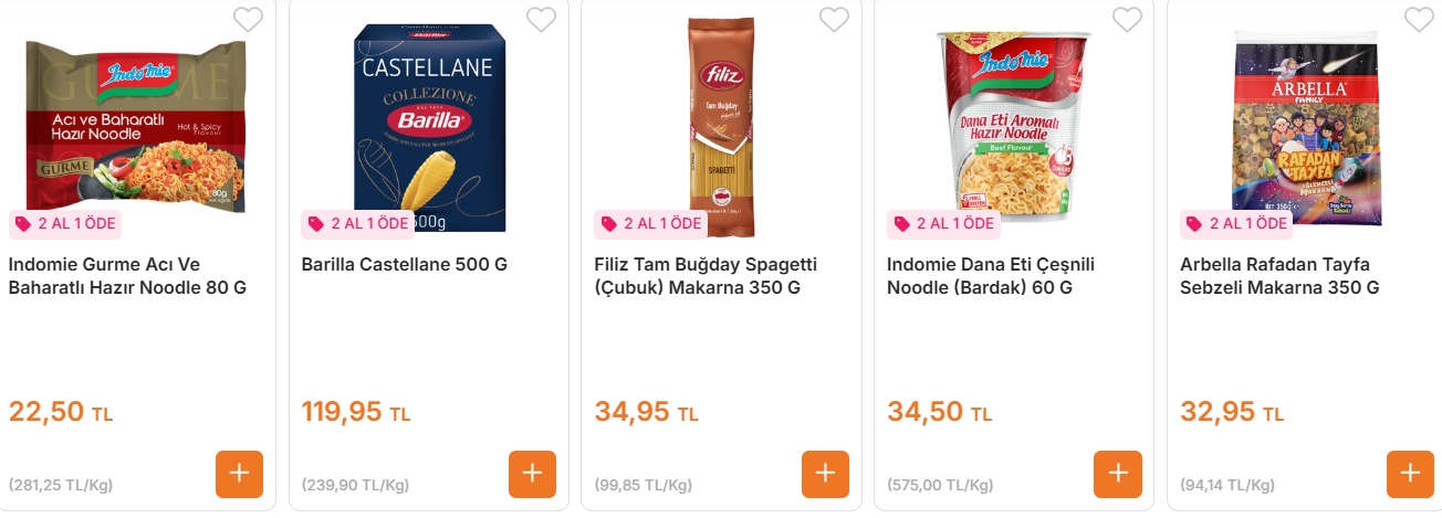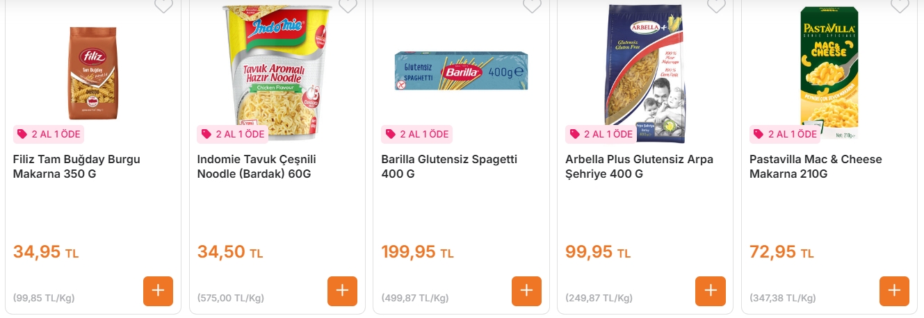 Migros, 27-28 Şubat tarihleri arasında geçerli olacak kampanya kapsamında listede yer alan makarnalarda aynı üründen 2 alana 1 ürün bedava fırsatı sunuyor. İndirim tutarı sepette otomatik olarak düşüyor.